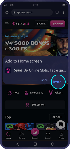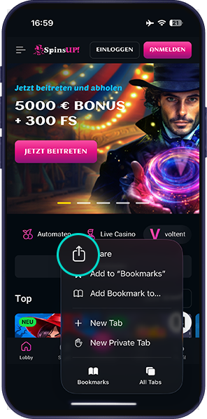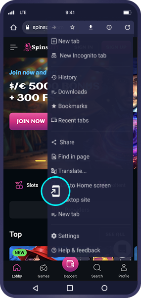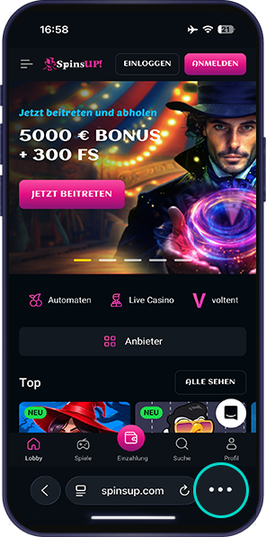 Go to the SpinsUP homepage and tap three dots to open the browser menu.