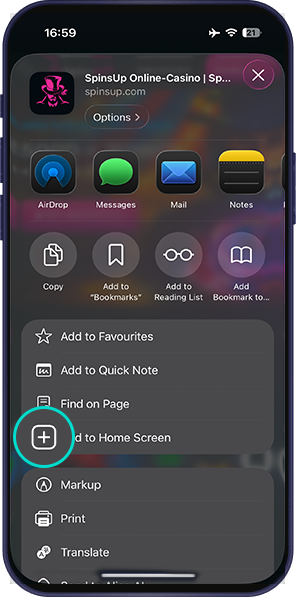 Open spinsup.com with Safari, tap “Share” on the bottom navigation panel